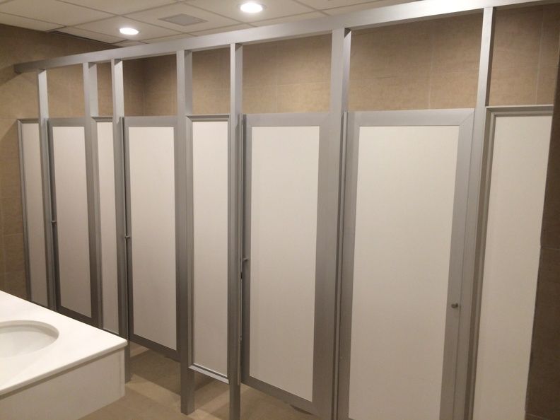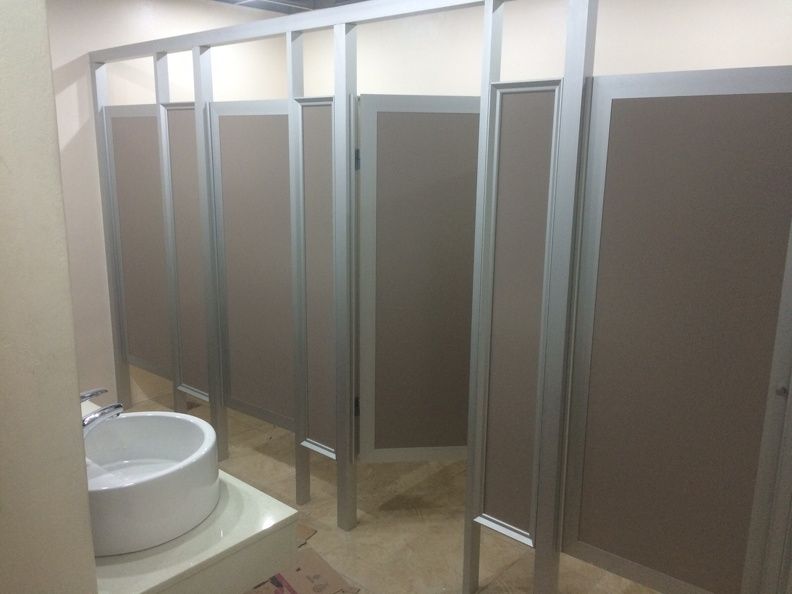 En esta empresa. realizaron los baños para mujeres y para hombres. Entre los materiales utilizados se encuentran marcos de aluminio anodizado Divisio System con alma de melamina color beige.